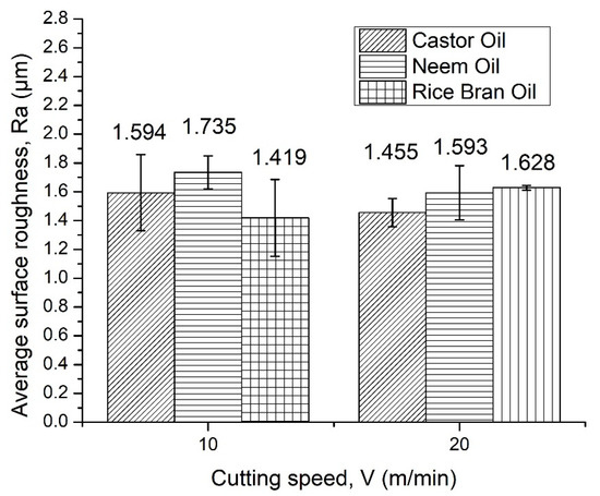 Further evaluation on the average surface roughness of castor, neem, and rice bran oils is shown in Figure 7. At the cutting speed of 20 m/min, the average surface roughness values for castor, neem, and rice bran oils were 1.455, 1.593, and 1.628 µm, respectively. A slight reduction of 9% and 11% was recorded when using castor in comparison to neem and rice bran oils, respectively. According to Benardos et al. [46], MCFs generally affect surface roughness in three different ways. Firstly, it absorbs the heat generated during the cutting process to cool the cutting tool and workpiece. Secondly, MCFs minimize the friction between the tool–chip and tool–workpiece interfaces, and lastly, MCFs function as a flushing medium for chip and wear particles. Consequently, the presence of MCFs improves the quality of a workpiece in terms of surface roughness.