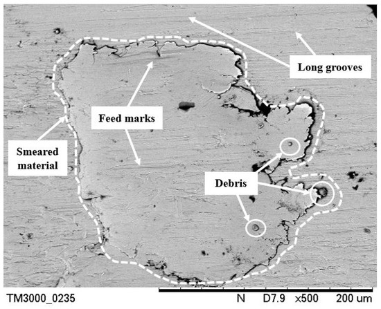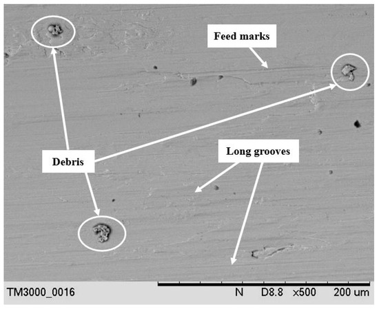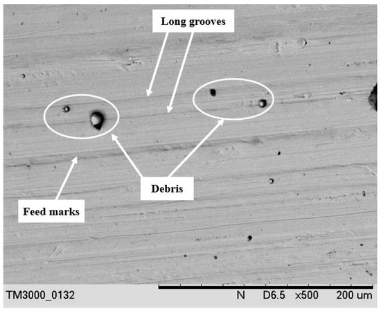 The results of surface defects on the drilled holes at a low cutting speed of 10 m/min using castor and neem oils showed the appearance of long grooves, debris, and feed marks as depicted in Figure 8 and Figure 9, respectively. Visible feed marks at different cutting speeds for castor and neem oils can be observed. As stated in previous research, the main surface defects on the machined surface of nickel-based alloys are feed marks and the deposition of foreign materials over the machined surface as a result of high thermal and mechanical loading [54]. The feed marks occurred as a result of an increase in feed. Long grooves and metal debris are also formed, due to the developed BUE, which was detached from the cutting tool and transferred to the machined surface [55,56]. These long grooves were also influenced by the tool wear and the chips adhered to the cutting tool [57].
