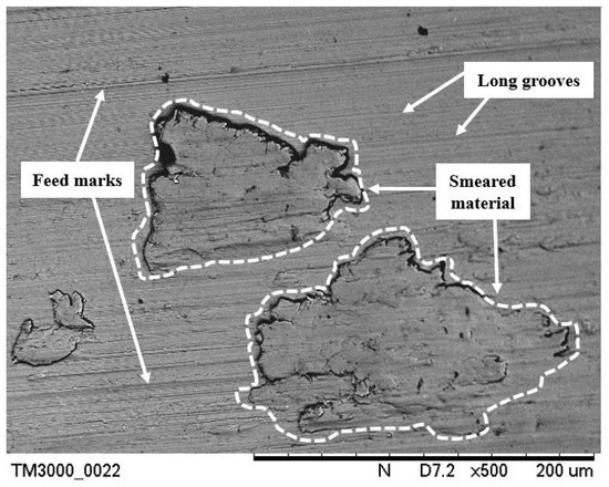 Detailed observations on the machined surface at a high cutting speed of 20 m/min (using castor and neem oils) are depicted in Figure 10 and Figure 11, respectively. When cutting speed was increased to 20 m/min, smeared materials were formed on the machined surface. This is attributed to the rise in cutting temperature, under which the workpiece material is more prone to plasticization. Since plastic deformation was dominated by heat, localized high temperatures at the tool–workpiece interfaces resulted in smeared materials on the machined surface [58].