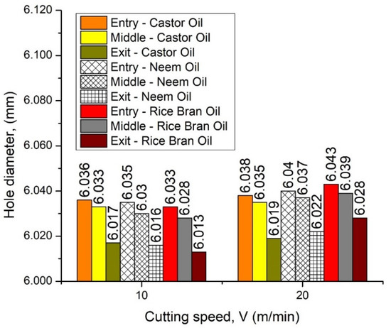 Figure 12 shows the hole diameters at three depth locations (entry, middle, exit) of the drilled Inconel 718 for different types of MCFs. It is apparent that the hole diameter for the three depth locations was marginally higher than the nominal diameter of 6.000 mm for the two cutting speeds. The closer the value of the drilled diameter to the nominal diameter, the better the accuracy, thus producing a lower error. All holes analyzed were oversized by 0.013 mm to 0.043 mm. At relatively high cutting speeds, the deviation on hole diameter increases at the entrance, middle, and exit of the hole. This is because as the spindle rotation speed increases, the vibration during entrance of the cutting tool also increases [59]. At 10 m/min, rice bran oil performed well in terms of the deviation of holes diameter, which contributed to the lowest deviation diameter (0.013 mm) at the exit of the drilled hole. Meanwhile, at 20 m/min, rice bran oil shows the highest deviation diameter (0.043 mm) at the entrance of the drilled hole.