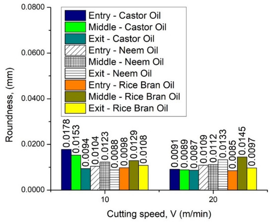 The smallest and largest values of roundness for the castor oil at the exit and entrance of the drilled hole are 0.0087 mm and 0.0178 mm for cutting speeds of 20 m/min and 10 m/min, respectively. For the neem oil, the roundness values recorded was 0.0088 mm and 0.0133 mm, which implies the lowest and highest value at the exit of the drilled hole for both cutting speeds. Meanwhile, the smallest and greatest values of roundness for rice bran oil are 0.0085 mm and 0.0145 mm at the entrance and middle of the drilled holes at 20 m/min, respectively. From the observation, there is no significant trend in the variation of hole roundness with increasing depth in drilling Inconel 718 using castor, neem, and rice bran oils. Nevertheless, an inconsistent reading was obtained at the three different depths of the hole. This result is in agreement with findings from Sultan et al. [55], who suggested that there is no clear pattern, and no significant difference was achieved when measuring roundness at different cutting speeds and feed rates. Zeilmann et al. [61] demonstrated a similar result under the MQL, flood, and dry cutting conditions for drilling AISI P20 steel. Similar to our findings, a significant trend cannot be evaluated for roundness values at different depths during the drilling of Inconel 718.