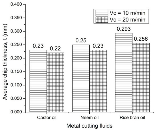 - The thinnest chip was produced by castor oil at a cutting speed of 20 m/min, in which it recorded a reduction of 4.35% and 14.06% in chip thickness compared to neem and rice bran oils, respectively. The chip thickness also depends on the viscosity of the oil. Hence, the highest viscosity of castor oil produced the thinnest chip, while the lowest viscosity of rice bran oil generated the thickest chip;