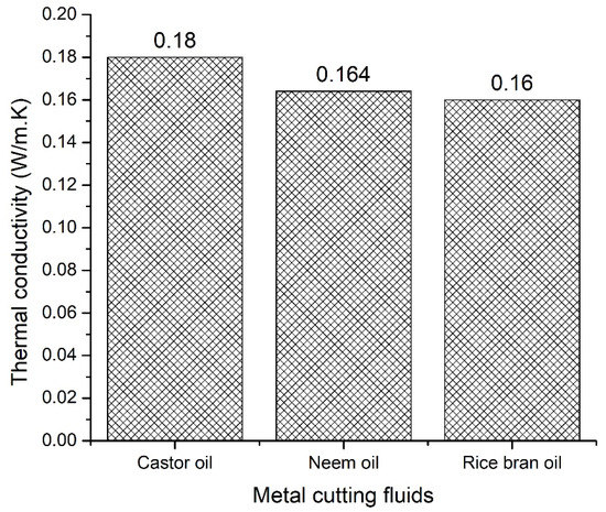 When machining difficult-to-cut material, a rise in cutting temperature lowers the tool strength, and increases the tool wear that attributed to higher surface roughness, incorrect dimensional accuracy, high cutting force, softening of cutting edge, and tool failure. According to Pervaiz et al. [66], chemical wear mechanisms including thermal cracking and diffusion are considered under a high-temperature region. Therefore, heat should be continuously dissipated away from the cutting zone so that the temperature is maintained within desirable limits. Based on Figure 15, castor oil has the highest thermal conductivity compared to neem and rice bran oils. The highest thermal conductivity of castor oil reduced the heat accumulated at the cutting zone and, as a result, the cutting temperature was reduced and the tool wear was minimized. The high thermal conductivity leads to the anti-friction properties of the MCFs, thus decreasing the surface roughness of workpiece significantly. Due to the excellent thermal conductivity of MCFs, their application in high-speed machining on difficult-to-cut materials is highly effective. To reduce the application of mineral-based oil, the utilization of vegetable-based oil MCFs with high thermal conductivity must be implemented.