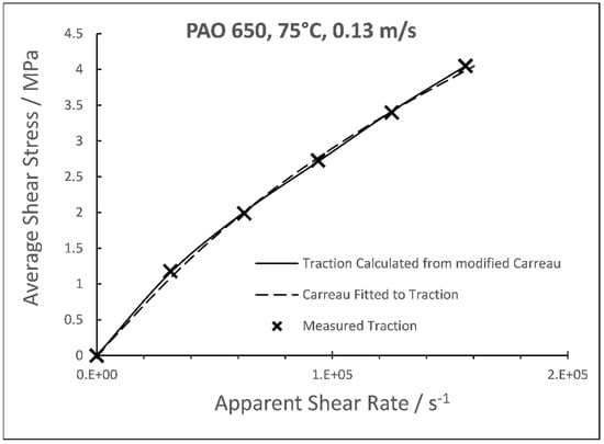 The measured average shear stress value in a traction measurement and predicted average shear stress using the measured Carreau parameters from a viscometer. The same Carreau equation has also been fitted to the traction for comparison in Figure 2.