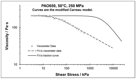 In reference [], the film thickness was correctly calculated from Equation (1) without adjusting the pressure–viscosity response. The average shear stress calculated in reference [] was in excellent agreement with the experimentally measured traction. It is shown in Figure 1 as the solid curve. The experimental traction measurements (the × symbols in Figure 1) were performed with a steel ball with a 12.7 mm radius loaded at 32 N against the face of a glass disc to provide Hertz pressure of 528 MPa and 352 MPa. Equation (2), fitted to the traction, is shown as the broken curve. The fit provides an average absolute relative deviation of 2.5%. The Carreau fit to the traction provides values of 3535 kPa, , and 32 Pa∙s. The low shear viscosity has a value of 32 Pa∙s for a pressure value of 235 MPa at 75 °C, which is 2/3 of the average pressure and 45% of the Hertz pressure. It has not been possible to extract the pressure dependence of the viscosity from EHL friction for many reasons [] which will not be listed here.