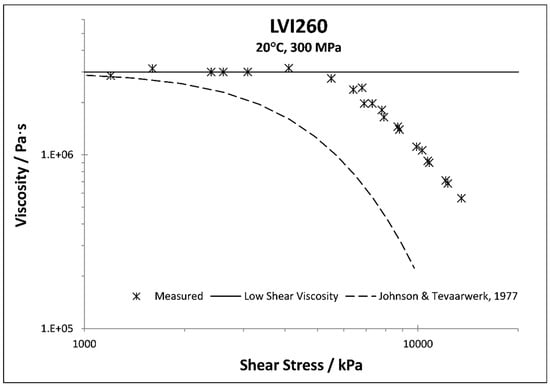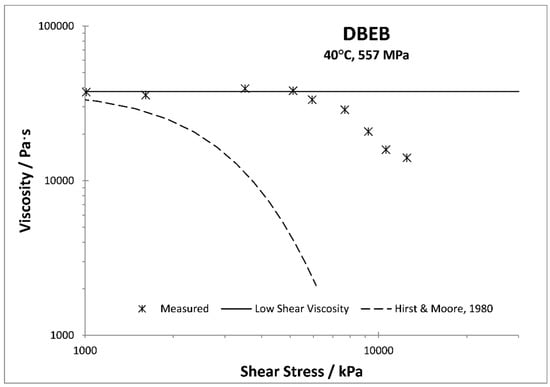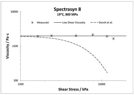A recent case for which friction has understated the Newtonian limit was offered by Imperial College []. The viscometer data [], generated at the request of the authors of [], are shown in Figure 5. The PAO 8 is Newtonian to at least 11 MPa, while the “Eyring stress” value is reported to be 2.5 MPa []. Clearly, the Newtonian limit must have been much greater than the “Eyring stress” value in the friction measurements as reported.