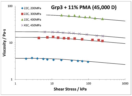 Figure 6 shows flow curves for a hydraulic oil that contains a polymer thickener. Polymers may be present for other purposes, such as dispersants. The ability to observe this type of rheology in lubricating oils has been available since 1969 []. There are commercial viscometers that can generate these data; however, the stress is greatly limited by shear cavitation []. The curves in Figure 6 represent the modified Carreau Equation (3) with values of 11 kPa and . To date, this behavior has not been found in an EHL traction curve. Certainly, no second Newtonian has been reported. Therefore, the assumption that a traction curve is the equivalent of a rheological flow curve has impeded the investigation of the rheology of polymer/oil solutions in EHL.