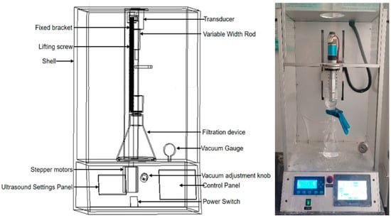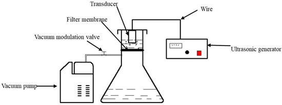 Combining the theoretical study of ultrasound-assisted artificial joint wear debris extraction and separation and the problems in the grinding chip extraction process, this study independently developed the VN-2 type microparticle and nanoparticle separation and extraction device. The working principle diagrams of the micro-nanoparticle separation and extraction device are shown in Figure 1. Separation and extraction of microscopic and nanoparticles using the VN-2 device is a special bench-type device and consists mainly of an ultrasonic system, a vacuum filtration system, and support components. The schematic diagram and physical photos of the micro-nanoparticle separation and extraction device are shown in Figure 2.