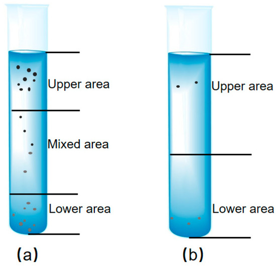 In the natural state, the particle settling velocity is closely related to the particle density, radius, shape, and solvent viscosity, where the density and radius have a substantial impact [36]. In this study, high-speed centrifugation at 10,000 r/min was used to accelerate the floating or sinking of different densities of wear debris. To achieve complete separation of two different densities of artificially jointed mixed wear debris. Under centrifugal settling conditions, the disturbance flow around the wear debris is dominated by laminar and transitional types. The particles in solution are dispersed by van der Waals forces, electrostatic repulsion, capillary forces, and other interactions of particles combined with each other into clusters of particles of different diameters and dispersion. As shown by the Stokes formula, the particle stabilization phase settling velocity is proportional to the square of the particle diameter, and particle clusters rather than a single particle settling velocity increases significantly. This type of settlement is called “group sedimentation” (Figure 14a). Group sedimentation can accelerate particle sedimentation and facilitate the separation and extraction of particles of different densities in solution.