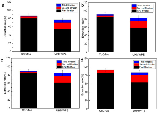The fourth separation of CoCrMo and UHMWPE extracted too few pieces of wear debris, all of which could not be weighed. Therefore, the first three centrifugal separations and extractions were taken into account. When the centrifugation time was 1 h, 2 h, 3 h, and 4 h, the first extraction rate of CoCrMo wear debris was 80.31%, 84.49%, 85.38%, and 85.46%, respectively. The extraction rate of wear debris increased by 4.18% more when centrifuged for two hours than when centrifuged for 1 h, and wear debris extraction rate increased by 0.89% and 0.97% more when centrifuged for 3 h and 4 h than when centrifuged for 2 h, respectively. The centrifugation was less than 2 h, and the extraction rate of CoCrMo wear debris was affected by the centrifugation time. The increase in extraction rate for CoCrMo wear debris was smaller as the centrifugation time increased. The first extraction rate of UHMWPE wear debris was 53.92%, 58.86%, 61.32%, and 63.20% when the centrifugation time was 1 h, 2 h, 3 h, and 4 h, respectively. The extraction rate of UHMWPE wear debris increased by 4.94% when the centrifugation time was 2 h compared with 1 h and increased by 2.46% and 4.34% when centrifugation was 3 h and 4 h compared with 2 h, respectively. When the centrifugation time was less than 2 h, the extraction rate of UHMWPE wear debris increased faster with the increase of centrifugation time. However, the extraction rate of UHMWPE wear debris did not increase significantly as the centrifugation time continued to rise. Centrifuged for 2 h, the second and third centrifugal separation extraction of CoCrMo wear debris increased the extraction rate by 3.9% and 6.34%, respectively, compared with the first centrifugal separation extraction. We reached a high level of extraction of CoCrMo wear debris by centrifugal separation. However, increases in centrifugal separation extraction resulted in wear debris extraction rates decreasing to below 4%. This indicates that even after increasing the number of centrifugal separations, growth in CoCrMo wear debris extraction rates was not evident. The extraction rates of UHMWPE wear debris were 58.86%, 16.79%, and 6.64%, respectively. With the increase of centrifugal separation extraction times, the extraction rate of UHMWPE wear debris gradually decreased, and the total extraction rate increased by 23.43% compared with the first extraction, so the extraction rate of UHMWPE wear debris could be significantly improved by increasing the number of centrifugal separation extraction times. The recovery rates of CoCrMo/UHMWPE mixed wear debris under different centrifugation methods are shown in Figure 5.