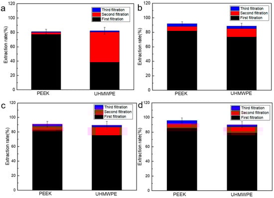 Recovery rate of PEEK/UHMWPE mixed particles with different centrifugation time and isolation times: (a) 1 h, (b) 2 h, (c) 3 h, and (d) 4 h.