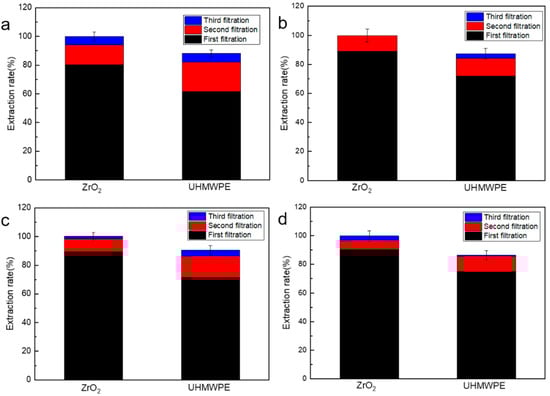 In the fourth separation of ZrO2 and UHMWPE, so little wear debris were extracted that it was impossible to weigh them, so the results of the first three centrifugal separations and extractions were used. The extraction rates of ZrO2 wear debris were 80.41%, 88.93%, 89.24%, and 90.20% for centrifugation times of 1 h, 2 h, 3 h, and 4 h, respectively. In a centrifugation time of 2 h, the extraction rate of ZrO2 wear debris increased by 8.52% compared to 1 h. The extraction rate of ZrO2 wear debris no longer increased significantly with the increase of centrifugation time when the centrifugation time was greater than 2 h. The extraction yield of UHMWPE wear debris was 61.59%, 72.01%, 72.50%, and 74.82% for centrifugation times of 1 h, 2 h, 3 h, and 4 h, respectively. Abstraction rate of UHMWPE wear debris increased by 10.42% for centrifugation time of 2 h compared with centrifugation of 1 h, and the extraction rate of wear debris increased by 0.49% and 2.81% for centrifugation of 3 h and 4 h compared with centrifugation of 2 h. Continued increase of centrifugal time has less effect on the extraction rate of UHMWPE wear debris. The extraction rate of both types of wear debris increased significantly with multiple centrifugations. As shown above, increasing the number of centrifugation extraction times can significantly improve the extraction rates of ZrO2 and UHMWPE wear debris. The recoveries of ZrO2/UHMWPE mixed wear debris under different centrifugation methods are shown in Figure 7.