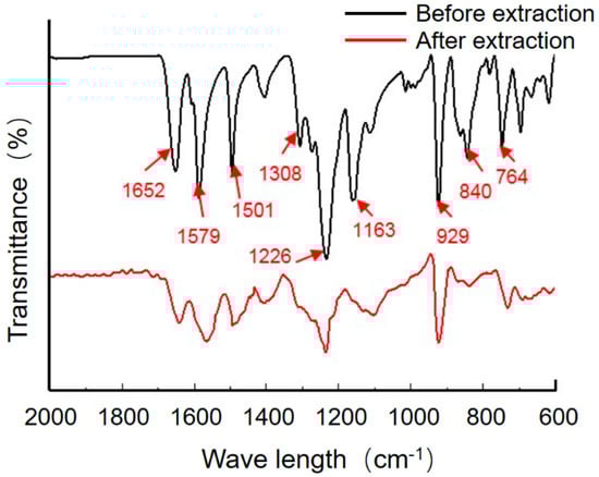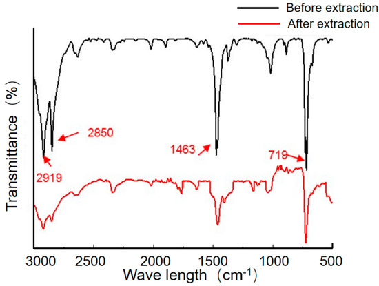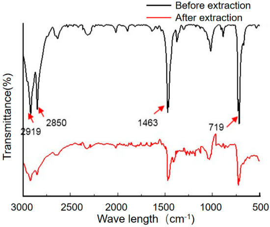 The FT-IR result (Figure 10) shown that the infrared absorption curves of PEEK wear debris after extraction and before extraction were consistent. Absorption peaks at 1652 cm−1 (C=O stretching vibration), 1501 cm−1, 1579 cm−1 (in-plane vibration of benzene ring), 1226 cm−1 (R-O-R asymmetric stretching vibration), 1163 cm−1 (in-plane C-H bending vibration of aromatic ether or aromatic ketone benzene ring), 840 cm−1, 764 cm−1 (out-of-plane C-H bending vibration of benzene ring). bending vibration), 840 cm−1, and 764 cm−1 (C-H out-of-plane bending vibration of benzene ring) appeared, which could indicate that the composition of the wear debris before and after extraction was PEEK. There was no admixture of UHMWPE wear debris or protein particles. The FT-IR result (Figure 11) showed the infrared spectral absorption curves of UHMWPE wear debris obtained from the upper zone solution extraction were the same as before extraction. The positions of the absorption peaks of the UHMWPE wear debris extracted from the upper zone solution and before extraction are the same, indicating that the wear debris extracted from the upper zone solution are UHMWPE. The PEEK wear debris and protein wear debris as well as other impurities are not mixed in the extraction process.