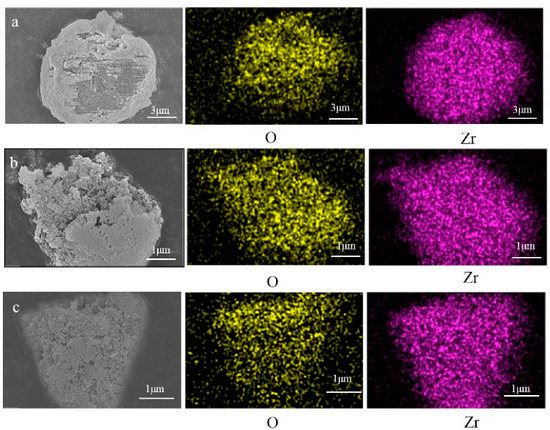EDS analysis (Figure 12) of solution-extracted wear debris from the lower zone of ZrO2/UHMWPE showed that ZrO2 wear debris agglomerated and formed large particle clusters. Zr and O elements occur around particle clusters and also sporadically in the area outside the particle clusters. It can be determined that the extracted wear debris are ZrO2 wear debris and occur as large particle clusters, small particle clusters, or individual particles. FT-IR (Figure 13) showed that the material structure of the extracted wear debris in the upper zone solution was the same as before extraction, indicating that the extracted wear debris in the upper zone were UHMWPE. The extracted wear debris were not mixed with ZrO2 or other impurities.