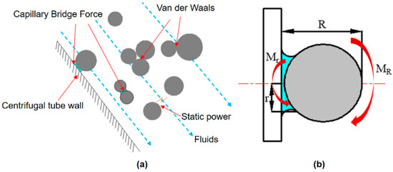 (a) Schematic diagram of fine particle flow in centrifugal tube; (b) schematic diagram of removal mechanism of particles attached to centrifugal tube wall.