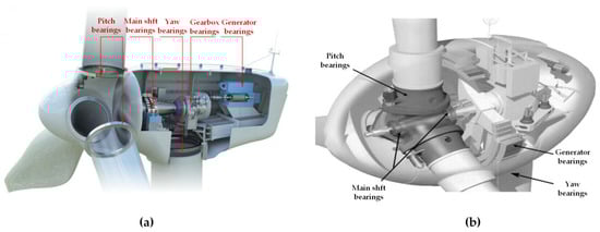 The majority of wind turbine generator systems are made up of mechanical and electrical parts that transform the kinetic energy of the airflow into electrical energy [8,9]. The gearbox speed-increasing kind of wind turbine is the most popular form and is seen in Figure 1a. With this type of wind generator setup, where the gearbox, generator, and rotor are installed in the nacelle, the generation efficiency and electrical output are relatively higher [10,11]. Another common design is the direct-drive style, shown in Figure 1b. Compared with the speed-increasing type, the direct-drive version connects the impeller and the generator directly, eliminating the complex gearbox and making the structure simple, yet the dimension of generator is larger [12]. The range of wind turbine bearings involves the central components used in the main shaft, pitch, yaw, gearbox, and generator systems in wind power plants, which correspond to the main shaft, pitch, yaw, gearbox, and generator bearings [13,14], respectively, with a service life of about 20–25 years. The intended service life is, however, hardly met because of the impacts of friction, corrosion, and impurity particles [15,16]. The health of bearings is critical to the stable operation of wind turbines, as various failure modes in bearings can cause severe injury to wind machine components [17]. To reduce these problems, it is crucial to identify the root causes of failures and provide early warnings. Only this way will increase the expected lifetime of the wind turbine components and decrease maintenance costs [18]. Therefore, it is essential to conduct early fault diagnosis and warnings for bearings.