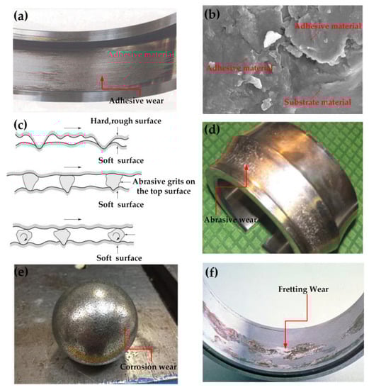 Wear is the effect of friction on materials in mutual contact, resulting in metallic depletion or residual deformations that alter the friction properties of the bearing. When dirt, dust, or flaking iron chips enter the lubricant, it prevents the formation of oil film on the raceway surface, which further aggravates the occurrence of wear. The continuous abrasion leading to the failure of the bearing to operate properly is referred to as wear failure [51]. According to the tribological definition and the material used in wind power bearings [52], the forms of bearing wear are classified into four categories.