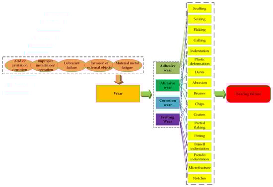 Wear is defined as the removal and consumption of material from contact surfaces caused by mechanical movements [51]. According to the mechanistic characteristics of the surface damage of wind turbine bearings, the common wear phenomena and mechanisms of the bearing wear process have been described in detail at Table 1 and Figure 4. In addition, on this foundation, we have further illustrated the causes and effects of wind turbine bearing frictional failure and made a comprehensive analysis of the failure modes, illustrated in Figure 5.
