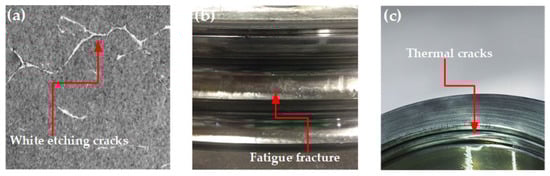 Thermal cracking usually occurs between the bearing rollers and raceways, where frictional heat from the sliding of the surfaces in contact with each other causes cracking. Mounting misalignment, lubricant failure, elevated impact loads, and excessive dust are the main causes of bearing thermal cracks. A sudden rise in temperature during bearing operations can cause changes in the structure and strength of the material, and when the stress exceeds the tensile strength of the material, thermal cracking appears [69,70], as shown in Figure 6c.