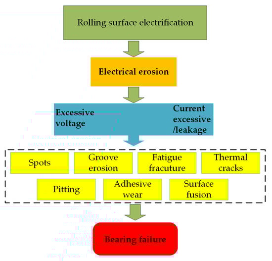 Bearing electro erosion is the breakdown of the contact part between the rolling element and the raceway by an electric current, resulting in localized melting and denting [74]. Based on the above in-depth discussion of corrosion phenomena and patterns, we have collated a comprehensive analysis of the causes and effects regarding the failure modes of electric erosion. This is shown in Figure 9.