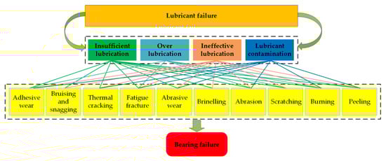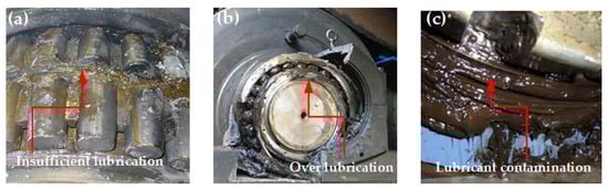 The utility of a lubricant is to prevent direct contact between the rolling element, raceway, and cage to keep the bearing in a well and stable working condition [79]. An effective lubricant can generate a lubrication film on the contact surface of the bearing, reduce the noise generated during running of the bearing, evacuate heat, and prevent the bearing from rusting or corroding [80]. The normal operation of the bearings depends on the existence of good lubrication between the components. Its failure is mainly attributed to insufficient lubrication, excessive lubrication, and ineffective lubrication, as shown in Figure 10.