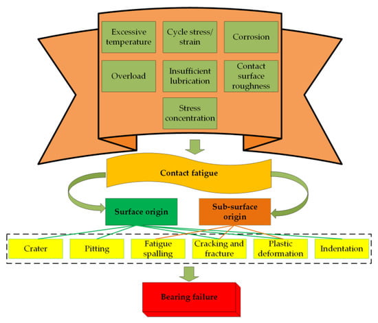 When the stress, temperature, and impact to which the bearing is subjected exceed the fracture limit of the material, partial fracture occurs inside or on the surface, and the phenomenon is called cracking [62]. When the cracks grow to a certain extent, making the bearing part of the material completely out of the bearing matrix, this phenomenon is called fracture [63]. As presented in Figure 6, the factors of common bearing cracks and fractures include the following three main aspects.