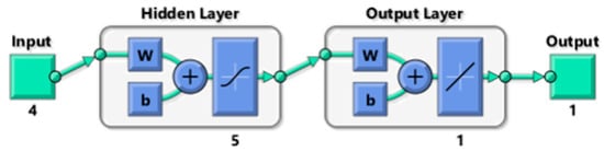 The artificial neural network (ANN) simulation started with a “training” process in which a set of inputs are applied to the network. After that, the resulting set of outputs is compared to known values. The training is performed until the error between the output and known values reach a predefined value. ANN is usually used with a high amount of input data, but it can be used successfully for small data sets as well [12]. A feed-forward backpropagation multilayer ANN is employed, with three inputs, five neurons in the hidden layer and one output used (Figure 1). Networks with 2–25 neurons in the hidden layer were trained. Training and testing of the ANN are conducted using the software MATLAB R2016a. The logarithmic sigmoid transfer function (logsig) and linear transfer function (purelin) are used as activation transfer functions, while the Levenberg–Marquardt backpropagation algorithm (trainlm) is used as the training algorithm.