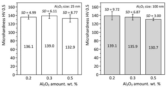The microhardness testing results (Figure 2) showed good repeatability of the results since the calculated standard deviations were below 7%. All nanocomposites showed more-or-less similar microhardness values, which was expected due to their similar microstructures [6,7]. Hardness typically increases with the increase in nanoparticle amount, but the interface between reinforcements and matrix as well as the distribution of reinforcements have a significant impact on composites hardness as well [13]. The uniform dispersion of the nanoparticles throughout the matrix is a demanding task, not easy to obtain [14]. The low influence of ceramic nanoparticles can be explained by the fact that their amount is very small and that the average Vickers microhardness indentation diagonal (approximately 85 μm) is significantly smaller than the distance between the nanoparticles, so the measured hardness values are most probably values of the nanocomposite matrix.