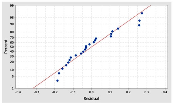 A normal probability plot of residuals (Figure 3) was used to verify the assumption that the residuals are normally distributed. As could be noticed, the prediction of wear rate with the formulated model is acceptable. The obtained R2 (R-squared) value of 0.9591 and adjusted R2 value of 0.9216 indicate a good fit of the model to the input data (R2 = 1 is a perfect fit).