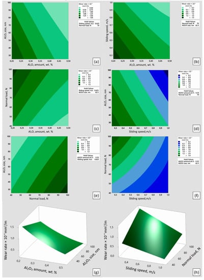 Wear maps for the tested nanocomposites, i.e., dependence of wear rate on: (a,g) Al2O3 amount and Al2O3 size, (b) Al2O3 amount and sliding speed and (c,h) Al2O3 amount and normal load, (d) Al2O3 size and sliding speed, (e) Al2O3 size and normal load and (f) sliding speed and normal load.