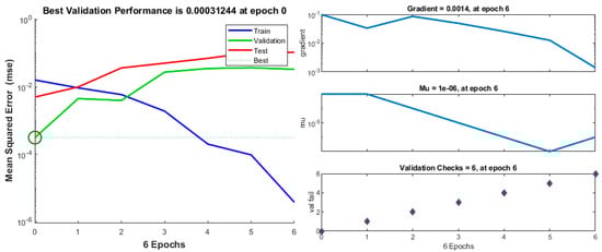 The experimental output values of the wear rates, shown in Table 2, are used for training, validation and testing of the ANN. It was trained using 70% of the data, while 15% was used for testing and 15% for validation. The performance of the modelled ANN is shown in Figure 5. Mean square error (MSE) for training initially has a high value which decreased to a very small value as the number of epochs increases, i.e., the ANN’s training process is being performed correctly. Even though training continues until epoch 6, the best validation performance is achieved at epoch 0 with a value of 0.00031244, and the final value of the gradient coefficient at epoch 6 is very close to zero, i.e., 0.0014. The regression coefficient for training, validation and testing, as well as the overall regression coefficient of the network, was obtained and shown in Figure 6. The overall regression coefficient of the network was very close to 1 (R = 0.98729), indicating a good fit and good agreement between the experimental results and the ANN model prediction.