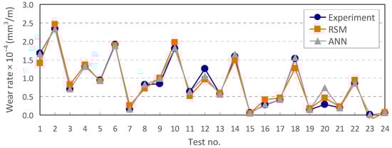 The values of the wear rate predicted with the modelled RSM and ANN, within the limits of the experiment, are presented in Table 5 and compared with the experimental data. Its graphical interpretation is shown in Figure 7. In both cases (RSM and ANN prediction), there is a good correlation between experimental and predicted values and both prediction methods can be used with high reliability. However, values obtained by the modelled ANN are closer to experimental values; therefore, it can be concluded that in this case, the ANN is more efficient in predicting wear rate.