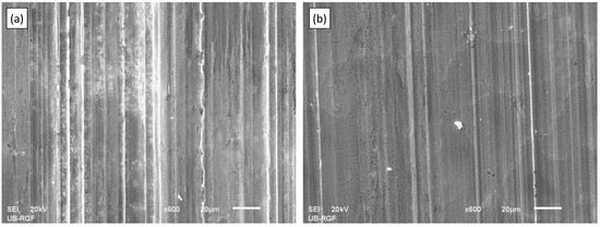 After testing, worn surfaces were examined using the SEM and EDS. The appearances of the worn surface did not differ too much regarding the test conditions. Worn surfaces of nanocomposites with different sizes of nanoparticles which had the highest wear were chosen as representative and shown in Figure 8. The dominant wear mechanism for all nanocomposites was abrasion, which is expected in mixed and boundary lubrication conditions. The presence of abrasive groves, with widths of approximately 10 to 20 μm, could be clearly noticed on all nanocomposites, but they are more pronounced and deeper on the nanocomposites reinforced with smaller-size nanoparticles. This is in accordance with the wear rate results, which showed that for the same testing conditions and the same amount of nanoparticles, nanocomposite reinforced with nanoparticles of approx. 25 nm (Figure 8a) showed a higher wear rate than the nanocomposite reinforced with nanoparticles of 100 nm (Figure 8b).