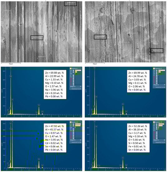 The EDS analysis results (Figure 9) of the worn surfaces presented in Figure 8 showed that there was no material transfer from the counter-body (steel disc) since the presence of Fe was not detected. The EDS analysis was performed in several points but only the most relevant results are presented in Figure 9. The presence of Al2O3 nanoparticles was not detected, since their size and amount were too small for this analysis. In some areas (Spectrum 4 and 18), higher amounts of Al were detected, but generally, the composition of the nanocomposites was according to the standard (Spectrum 1 and 21).