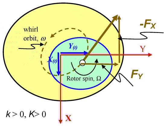 where ΔX and ΔY are the rotor lateral displacements and KXY = −KYX = k are the cross-coupled stiffness coefficients. KXY > 0 to induce forward whirl, while KYX < 0 for backward whirl, i.e., opposite to the sense of the shaft rotation.