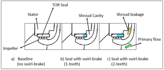 Knives on a rotor (TO) impeller eye seal: baseline and modified with a swirl brake. Reproduced with permission from Ref. [20].