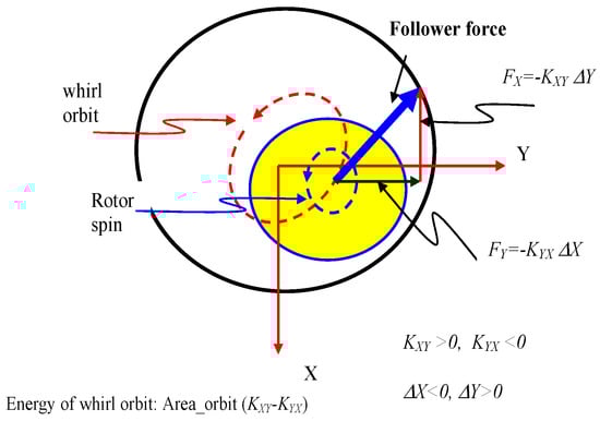 The first type of force is known as the clearance–excitation force, while the latter is typified as an impeller–casing interaction. An aerodynamic destabilizing force is a follower force, driving the rotor into forward whirl motion, as depicted in Figure 5. The components of the force are defined as