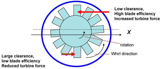 In 1958, Thomas [4] postulated that destabilizing aerodynamic forces in axial (steam) turbines are the result of the non-uniform tip clearance induced by an eccentric rotor, resulting in the whirl of the rotor. In a turbine whose center is eccentric (e), Thomas noted that variations in the clearance cause a change in blade efficiency, i.e., blades with a smaller tip clearance restrict leakage, and the force acting on the blade increases, see Figure 6. The opposite effect occurs in the region of larger local tip clearance. As a result, a net tangential force (Ft) is generated that tends to cause forward (destabilizing) whirl; i.e., in the direction of rotor spinning and with Ft = (k × e). The Thomas “clearance–excitation” force is proportional to the mass flow rate () through the turbine and the enthalpy drop (ΔHD) across a stage, and inversely proportional to shaft speed (Ω). Thus, this force is load-dependent, a function of the applied torque (T0). Recall that mechanical power equals (T0 × Ω)~.