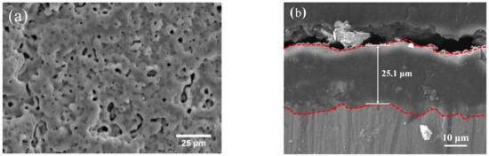 SEM surface (a) and cross-section (b) images of PEO coatings.