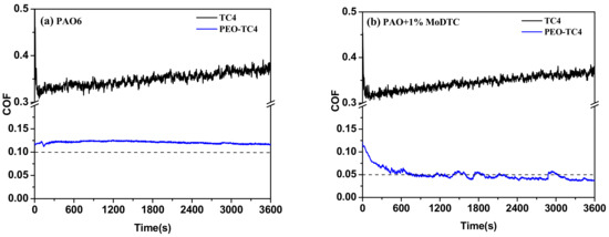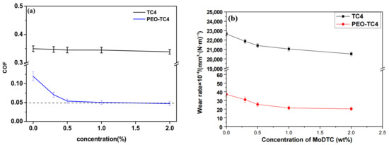 The effect of the MoDTC concentration in the PAO base oil on the tribological properties was evaluated. As shown in Figure 4a, the COF of the bare TC4 sample remains around 0.35, regardless of whether or not MoDTC is added to the base oil. In contrast, the COF decreases with the increasing MoDTC concentration for the PEO-treated TC4 samples. The COF remains stable at 0.05 when MoDTC concentration in the base oil exceeds 0.5%.