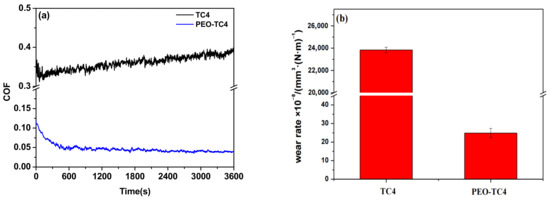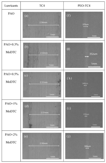 As shown in Figure 4b, the wear rate of the bare TC4 sample lubricated by the base oil is 2.3 × 10−4 mm3/(Nm) and decreases slightly with increasing MoDTC concentrations in the base oil. The wear rate of the bare TC4 sample is still high (2.1 × 10−4 mm3/(Nm) even under lubrication of PAO + 2% MoDTC oil. In contrast, the wear rate of the bare TC4 is reduced significantly after the PEO treatment and decreases with increasing MoDTC concentrations. The wear rate of the PEO-treated sample lubricated by the base oil is only 37 × 10−8 mm3/(Nm). At an MoDTC concentration of 2%, the wear rate is 20 × 10−8 mm3/(Nm), which is three orders of magnitude lower than that of the bare TC4 sample.
