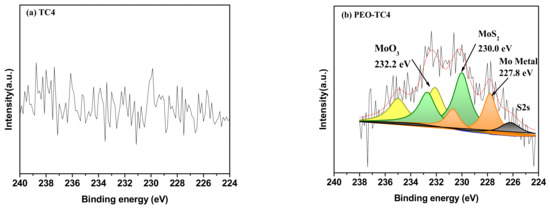The wear tracks of the bare and PEO-treated TC4 lubricated with base oil containing 1% MoDTC were characterized by XPS to clarify the tribochemical reaction of the MoDTC film. As shown in Figure 7a, for the bare TC4 sample, no significant peaks were observed in the Mo3d spectra, suggesting no tribofilm existed in the contact area. It agrees with the observation of similar friction behavior of the TC4 sample lubricated by the base oil with and without MoDTC. However, for PEO-treated TC4, surface chemistries of the tribofilm were totally different. As shown in Figure 7b for the Mo 3d spectra, there is a strong peak at the position of 230.0 eV for MoS2, along with the contribution of MoO3 at 232.2 eV and metallic Mo at 227.8eV [19,20,21].