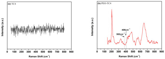 Raman microscopy was also used to confirm the presence of MoS2 in the tribofilm for the PEO-treated TC4. Two peaks at 406 and 382 cm−1 were found in the Raman diagram of Figure 8, which were assigned to the A1g and E2g modes of MoS2, respectively [10].