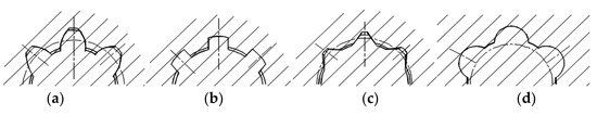 According to the tooth profile of the spline, splines can be divided into involute spline, rectangle spline, triangle spline, and circular arc spline. As shown in Figure 1a, the tooth profile of the involute spline has an involute curve. The tooth of the involute spline always experiences a radial force, which makes the involute spline automatically self-centering and further guarantees that every tooth bears the same load. The involute spline has a high load capacity and is widely applied for connection with high load and high centering accuracy requirements. As shown in Figure 1b, the centering accuracy of the rectangle spline can make sure by minor diameter centering; the rectangle spline is used for connections with static or light loads. As shown in Figure 1c, the internal spline tooth profile of the triangle spline is a triangular shape, and the external spline is an involute shape with a 45° pressure angle. Triangle splines are mostly used for light load and static connections with small diameters, especially for thin-walled parts [2]. As shown in Figure 1d, the tooth profile of the circular arc spline is circular. The contact area and tooth thickness of the circular arc spline are much bigger than those of the involute spline, which effectively reduces fretting wear and stress concentration and improves load capacity. The circular arc spline is mainly used for connection with large misalignments.