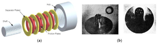 Splines can be divided into single-stage and multi-stage spline coupling, depending on their functions. The multi-stage spline can reduce torque fluctuation to a certain level and compensate for significant misalignment. Figure 3 shows two representative multi-stage splines (i.e., multi-stage splines with friction plates or a spline sleeve). As shown in Figure 3a, when applying an axial force on the multi-stage spline with friction plates, contact and friction would generate between the internal and external splines, which further transmit torques between the spline shaft and the spline sleeve [5]. As shown in Figure 3b, this type of multi-stage spline inserts a spline sleeve (ring) between the internal and external spline. Such a spline sleeve can be made of various materials, such as metal and nylon [6].