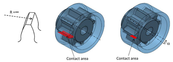 Crowned splines are very useful for angular misalignments. However, the crowned splines are not suitable for aligned conditions. Under aligned conditions, splines with extensive crowned modifications would suffer high stress concentration and potential tooth breaking. For aligned conditions, as shown in the second diagram of Figure 7 and Figure 8, crowned splines have smaller contact areas compared with straight splines. Straight splines have larger contact areas to decrease contact stress.