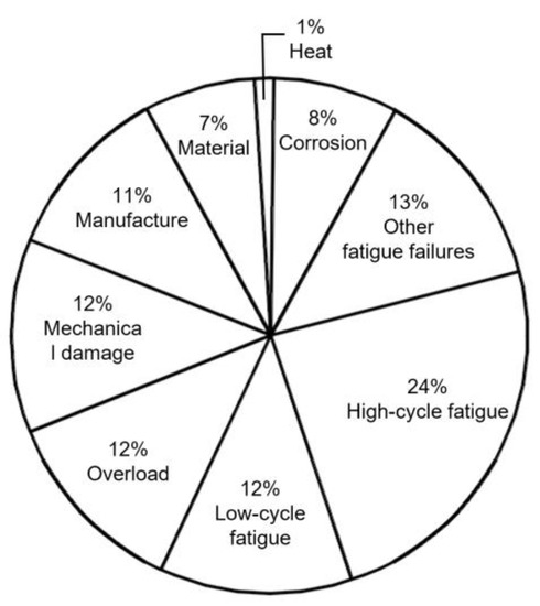 Fatigue strength is the main factor for spline failure, and Chen [13] summarized the failure modes of aero engine accessory drive systems, as shown in Figure 9. The results show that nearly half of failures are fatigue failures. In addition, Cuffaro et al. [14] conducted experimental tests on the damage modes of common splines and crowned splines. They investigated the effects of parameters such as clearance, surface roughness, lubrication condition, and angle misalignment on tooth surface damage. Their results showed that crowned splines have a completely different wear pattern compared with straight splines, and surface damage on crowned splines is greatly influenced by misalignment and lubrication states.