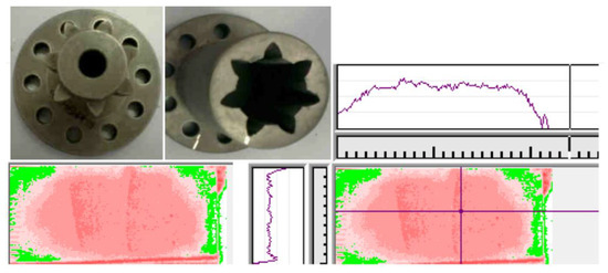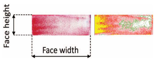 Cuffaro [32] measured spline contact stress distribution using the same film previously used in Ref. [31]. The tested spline specimens and the test results are shown in Figure 11. The results showed that the trend of contact stress distribution is consistent with simulation results, and the errors of stress distribution under different torques gradually differ between 2.8–15.6%. In general, the film can properly predict the distribution trend of contact area and pressure. Actual micro-contact characteristics of the spline were obscured by a relatively thick (0.2 mm) flexible film between tooth surfaces. Obtaining a satisfactory stress distribution under the condition of small tooth surface area and misalignment of typical aviation splines is difficult because of the limitation of film resolution.