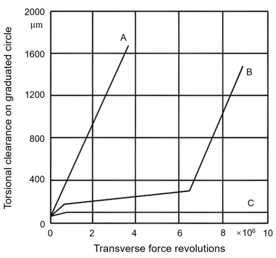 Most damage of tooth-side centering splines is caused by wear. Spline wear can be generally divided into three stages, as shown in Figure 13 [34]. The first stage is a short running-in process, the second stage has an approximate constant wear rate, and the third stage has a strong damage effect. The results of the spline wear test showed that three wear stages do not always exist simultaneously, shown as Curves A and C in Figure 13. In addition to friction and wear parameters, the working state also plays an important role in the wear process. Splines with large torques wear more severely than those with large transverse forces [34].