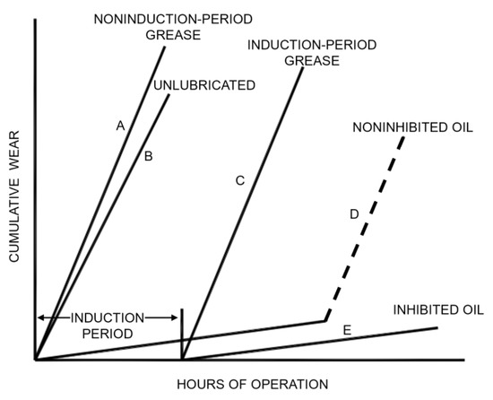 In-depth experimental studies on the spline wear process were conducted by Weatherford and Valtierra [38]. They studied the effects of crowned amount, misalignment, lubrication, materials, working temperature, and surface treatment on spline wear. The qualitative effect of lubrication on spline wear in the dry air environment is shown in Figure 15. They found that a suitable lubricant will create an induction phase at the initial operating stage, which considerably delayed spline wear. Rapid wear with a consistent wear rate will happen when the lubrication runs out or the spline surface is damaged. They also found that the wear rates are different when the lubricants are different. Mura et al. [39] added graphene to standard grease to produce a high-performance lubricant effect. The friction force of different grease graphene compounds was measured through experiments. The results showed that grease mixed with graphene could reduce the friction coefficient.